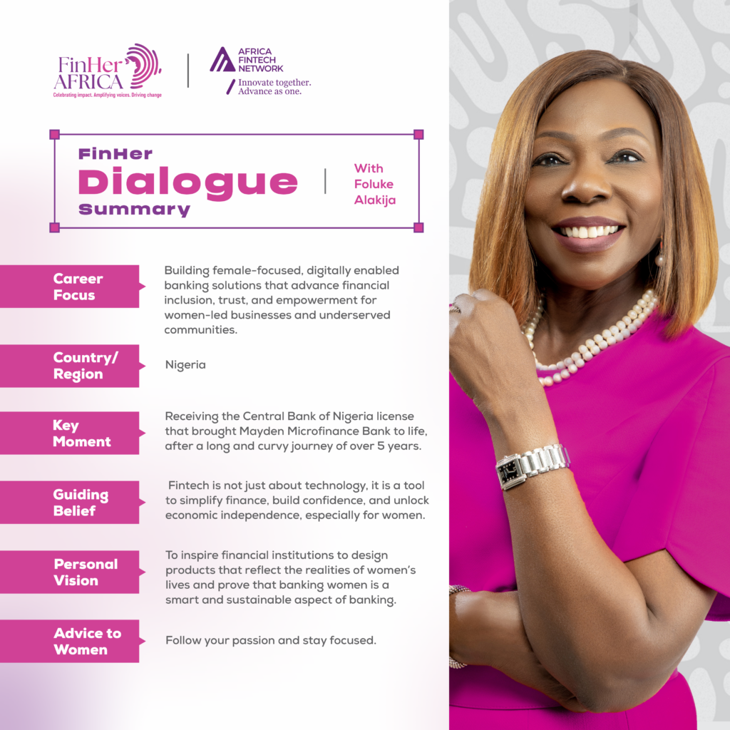 Empowering women through inclusive, digital-first banking, whilst being open to everyone. Foluke Alakija is a Founder & Managing Director, Mayden Microfinance Bank, created to redefine the banking experience for women in Nigeria by recognizing them as powerful economic drivers with unique financial needs. The bank’s core values reflect a purpose beyond profit, aiming to contribute to broader development goals by closing the financial inclusion gap for women.