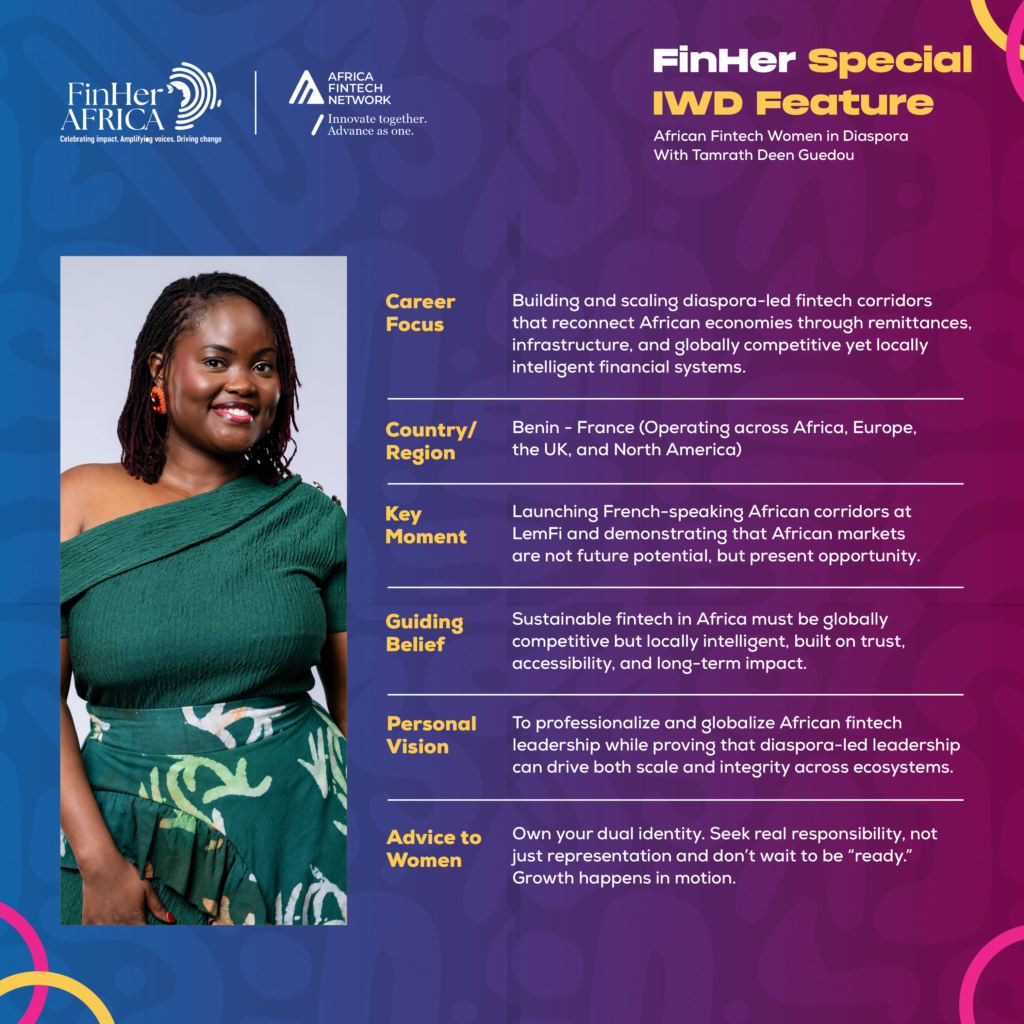 Tamrath DEEN GUEDOU is a fintech leader from Benin Republic, Africa, based in France, Europe. She drives cross-border growth and strengthens diaspora financial corridors across key markets.